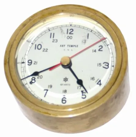 Beveled glass, good hands including seconds. Dial signed, "Art Temple / U.S.A.". Brass case is 3.75" diameter....