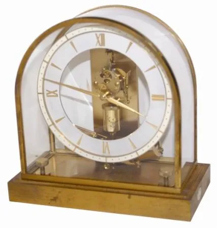 Junghans electric/battery clock, brass case, dome, and movement, battery underneath the base. The battery is signed, "Vigor / CM-Mis/871 / Clock Battery / Size 8,9 1.5 Volts".