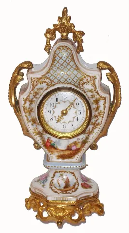 French, lady's boudoir timepiece, in a porcelain case, with a very small cylinder 'scape movement with fancy dial and hands, C. 1900