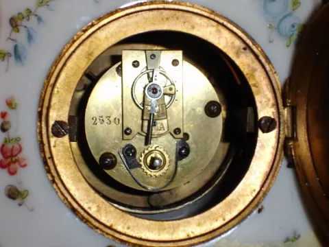 Decorative porcelain case in very fine condition. Original porcelain dial is perfect and the hands are original. Small round French balance wheel move...