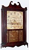 Case missing front foot and some veneer, one scroll repaired. Partial label (not enough to determine maker). Dial missing some paint, lower glass clea...