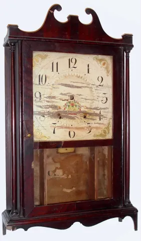 Pillar and Scroll mahogany veneer case and dial only c1825 and a Seth Thomas 9 1/2 strap brass movement