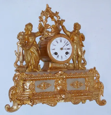 French, 8-day time/strike figural mantel clock, young couple in the garden, C. 1870
