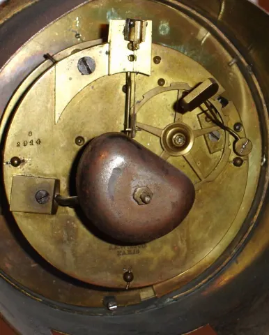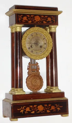 French, 8-day time/strike Empire style portico 4-column mantel clock with an inlaid case and cast pendulum, C. 1890