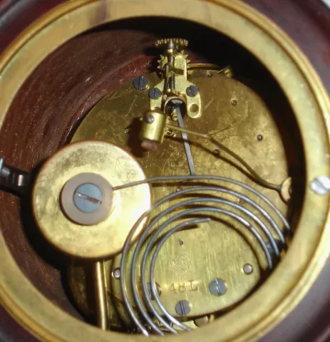 Mahogany case in clean condition in original finish with some minor dings. French style round plate brass movement striking on a gong. Original porcel...