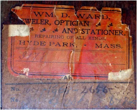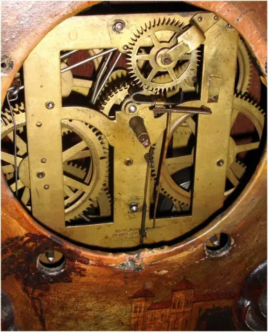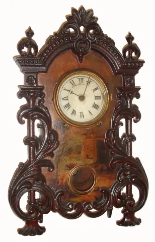 Original dark rich brown finish with painted Venetian scene, no damage. Original painted metal dial is worn and flaking slightly at 3. Wooden case bac...