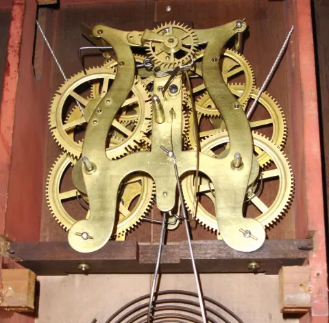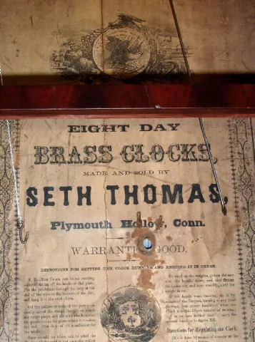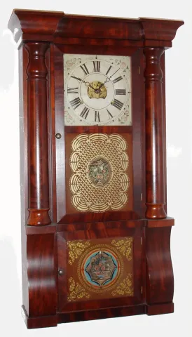 Seth Thomas, Plymouth Hollow Conn., mahogany 8-day weight-driven time and strike column and cornice shelf clock, C.1863.