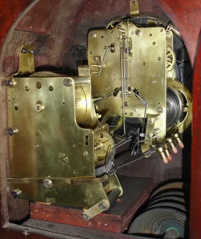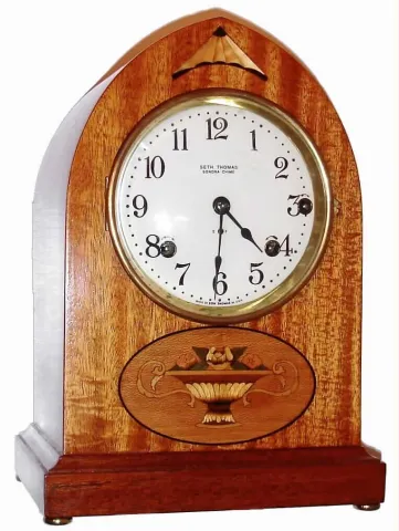 Seth Thomas Clock Co., Thomaston, Conn., 5-Bell Sonora-Chime inlaid mahogany 8-day mantel clock, dated 1916.