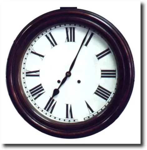 Round Gallery Wall Clock Circa 1890. 8-day time and strike pedulum driven movement. Walnut case with 14" dial. - Dimensions: 16"h x 16"w x 4"d