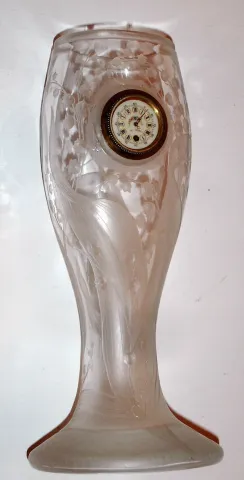 French, Lalique Art Nouveau glass vase engraved on the bottom "Le Rosey", Paris, fitted with a small front key wind watch movement.