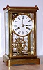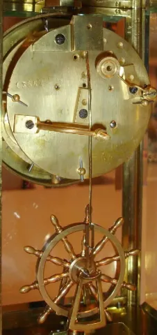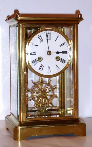 French crystal regulator mantel clock 8 day time and strike movement with ship's wheel as detached balance and Roman numeral porcelain dial, c1890