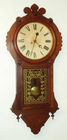 there is a good full label on the back; two lower finials are accurate replacements. Tablet has been repainted to match Kroeber 1881 catalog. Clock is...