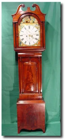 Scottish 8- day breakarch dial painted longcase clock, circa 1830 A small attractive flame mahogany belly door Scottish 8- day breakarch dial painted longcase clock by "Christie and Barrie" of Abroath. "The Cotters Saturday Night" painted in the break arch with four seasons to the corner spandrels. The mahogany case with full tapered mahogany columns with wooden ringed capitals sitting on splayed feet. The breakarch swan necked hood with matching tapered mahogany columns. 8-day movement with subsidiary seconds and date. 81" x 19" x 10.5" Additional keywords: longcase, tallcase, grandfather