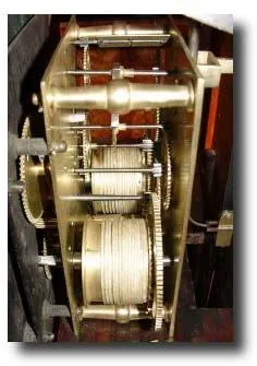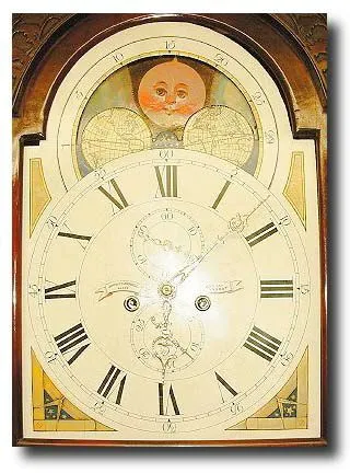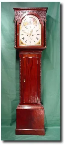 Scottish Cuban mahogany longcase clock, circa 1830 Flat topped Cuban mahogany break arch painted dial English longcase clock with leafy carved blind fretwork to hood, staggered twisted mahogany columns to hood. 8-day painted dial movement with masonic sectors to corner spandrels. Painted moonroller disc with scene of galleon at sea and country cottage scene. Painted globes below breakarch, Circa 1830. Maker "John P Campbell", Govan, Glasgow. 82" x 20" x 10" Additional keywords: longcase, tallcase, grandfather