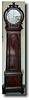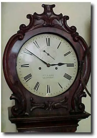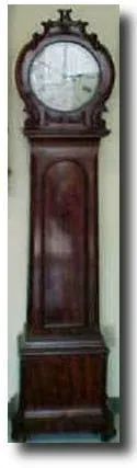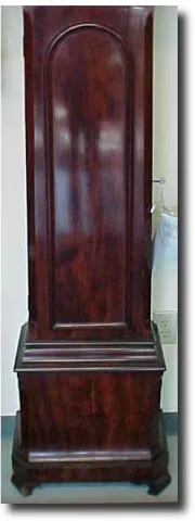 Featuring a carved bonnet and tapered base. Note the chamfered corners and scroll feet on the mahogany base. Completely original. The eight day movement strikes the hour on an original gong ( not converted from bell), and uses a regulator type dead beat escapement. The painted dial has a seconds bit. Made by William Lamb of Glasgow, a listed clockmaker,C1880. Additional keywords: longcase, tallcase, grandfather