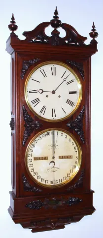 Ithaca Calendar Clock Co., Ithaca, New York, "Regulator No. 1" or "Hanging Bank Clock" double dial calendar wall clock 8 day time only two weight movement with perpetual calendar in walnut case, c1875