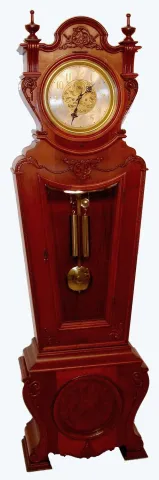 Waterbury Clock Co, rare floor standing Regulator No. 62, in a mahogany case with unusual keystone shape, quality 2-weight striking mov't and silvered dial with raised brass numerals and fancy center.