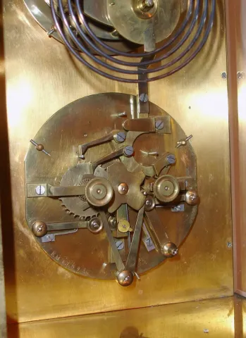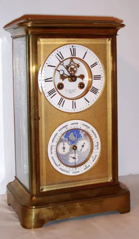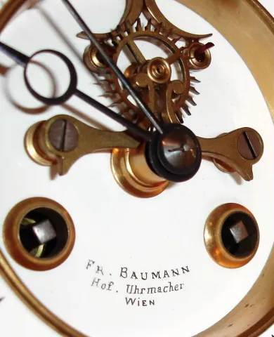 French, 8-day time/strike brass and glass double dial crystal regulator calendar clock retailed by Fr. Baumann, Wien., the calendar dial is perpetual, correcting for short months, and with phases of the moon. Dials are offset by a stippled and gilt brass