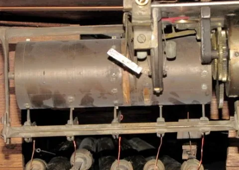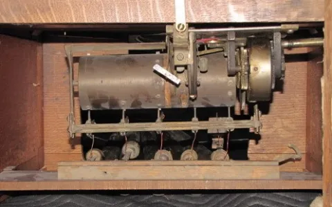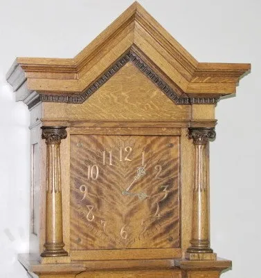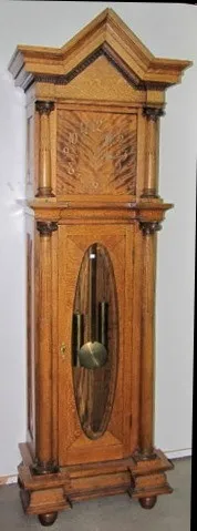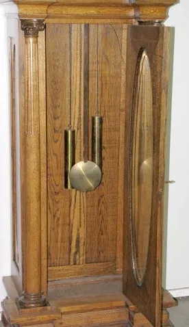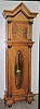Waterbury Musical 5 Tube Tall Case Clock: ornate carved oak; 2 weight; tubes hidden behind wooden back; beveled glass door; brass weights and pendulum...