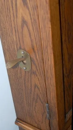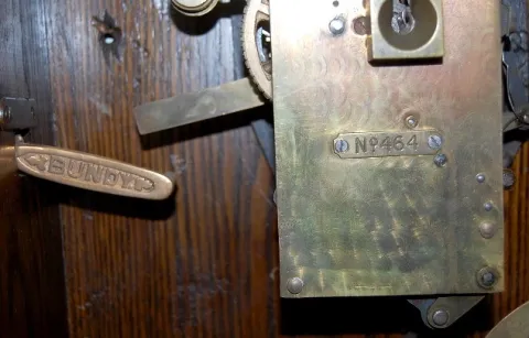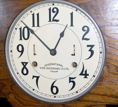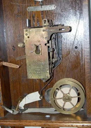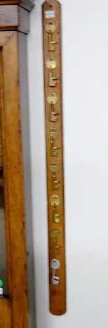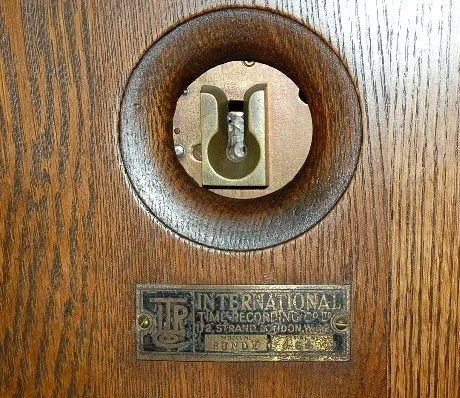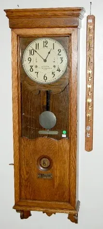 I.T.R. London Time Clock w/Keys: oak wall hanging case; original tag; 9 1/2" dial. 54" *** Please note, this item is F.O.B. Marshalltown, IA, you must...