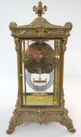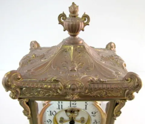 Ansonia Elysian Crystal Regulator Clock: 8 day; time and strike; ornate; beveled glass; 2 piece porcelain dial; open escapement; copper finish; circa ...