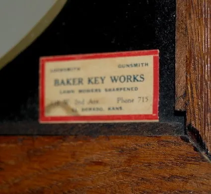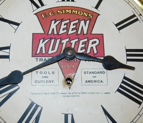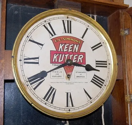 Keen Kutter Advertising Gallery Clock: oak hanging case with pendulum and key; paper dial. 25" x 16"...