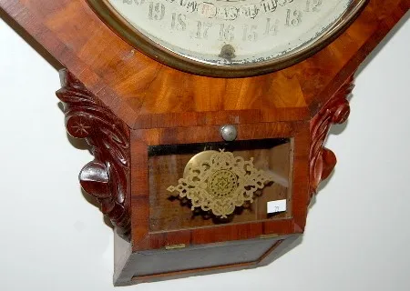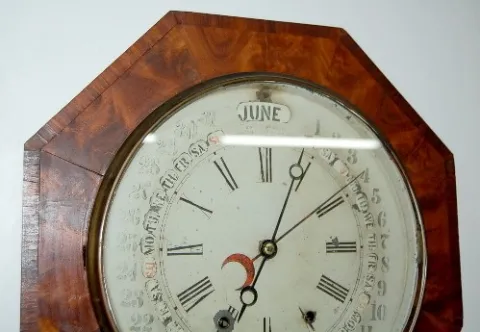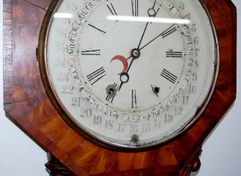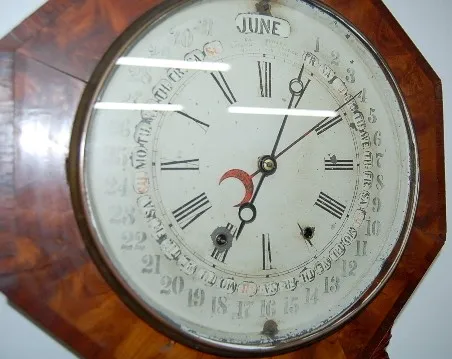 Gilbert Maranville Calendar Clock: octagon; painted metal dial; has interior lower label; painted lower glass; veneer case; not tested. (Small pieces ...