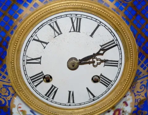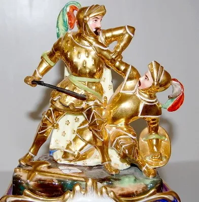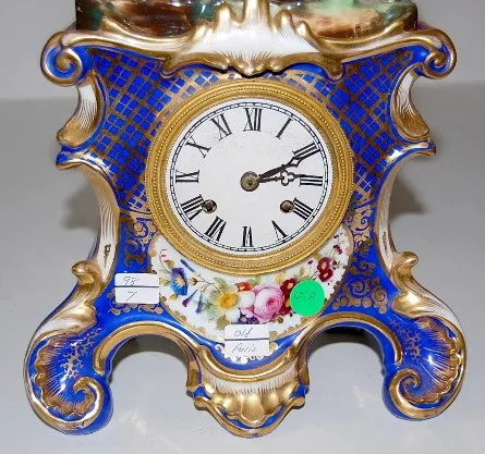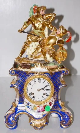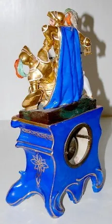 French Old Paris 2 Piece Clock: T and S; cobalt and gold gilt; top has 2 crusaders fighting; hand painted floral decoration. (One tassle has been glue...