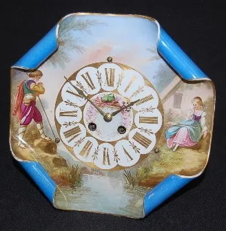 French Sevres Type Porcelain Plate Clock: hand painted; folded corners; boy and girl; time and strike; 8 day; easel attached to bck; gold painted Roma...