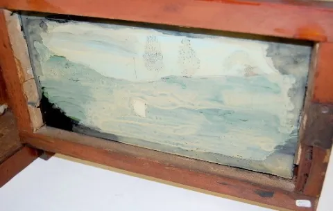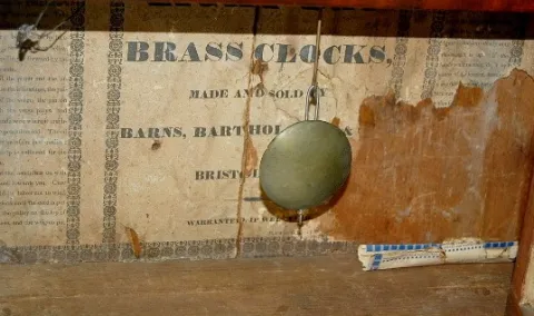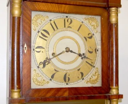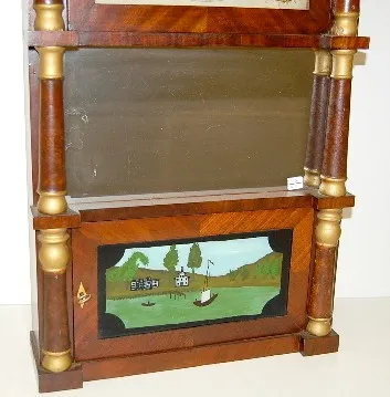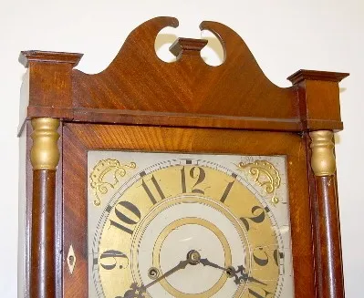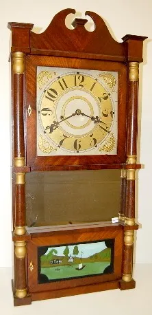Barnes, Bartholomew Triple Decker Clock: mahogany case; wood works; wood dial; old weights; brass movement. (Replaced tablet.) 36 1/2" x 16 1/4"...