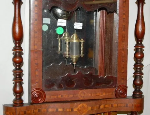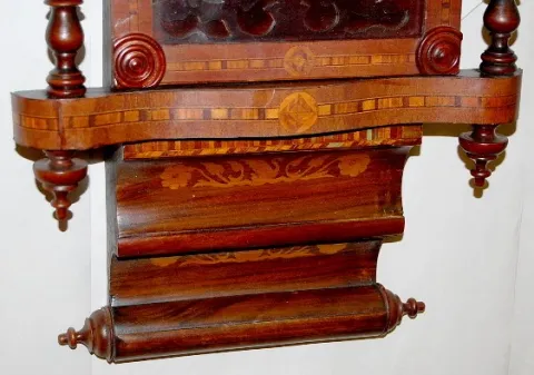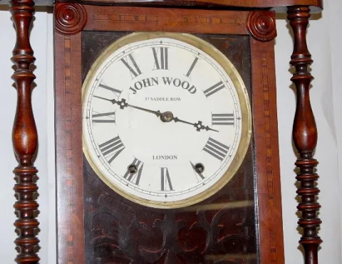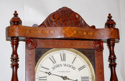 Chauncey Pillar and Scroll Inlaid Clock: painted metal dial "John Wood 17 Saddle Row, London"; time and strike; has pendulum. (Restoration) 35"...
