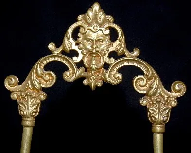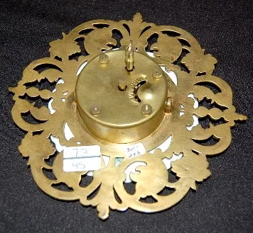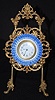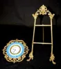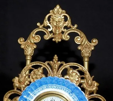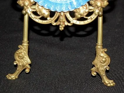 New Haven China and Metal Easel Clock: signed on dial; china plate frame on a metal griffin head, ornate cutout frame; metal easel has a man's head at...