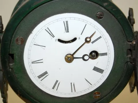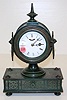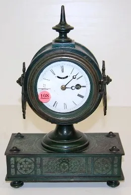 Tucker Bronze Shelf Clock, Signed S.E. Root: porcelain dial; moon hands; green finish; time only; 30 hour movement signed S.E. Root, Bristol, Ct.; cir...