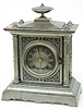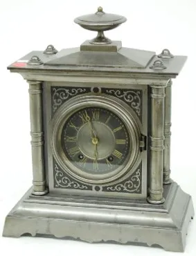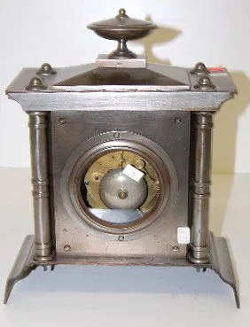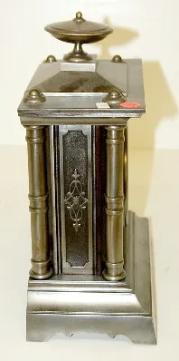 Seth Thomas and Sons Metal Case Clock: time and strike; metal dial with Roman numerals; 4 column with urn top; marked round movement with bell; with p...