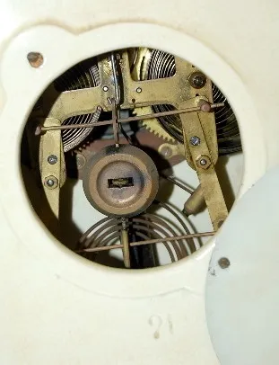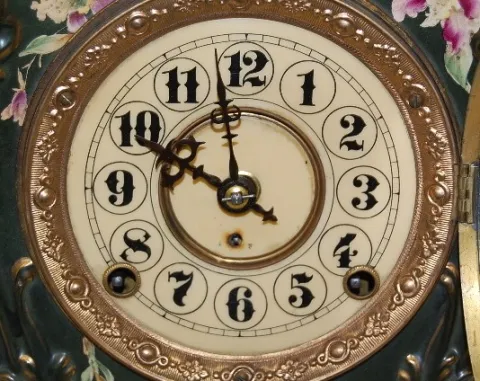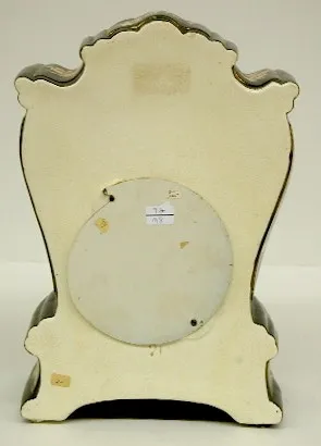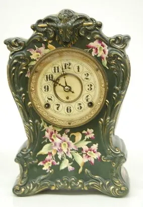 Kroeber Rams Head China Clock: celluloid dial; 8 day; time and strike; moveable pendulum; dark green case decorated with orchids and a ram's head; mov...