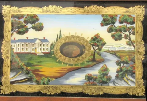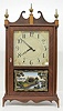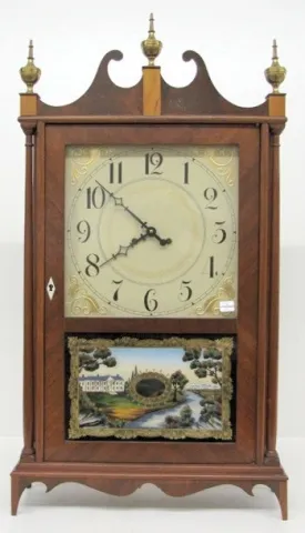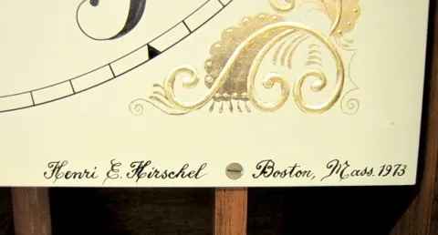 Signed Henri and Hirschel Pillar and Scroll 1973 Clock: painted wood dial; ornate glass tablet; has pendulum and key; not tested. (Top 2 scrolls have ...