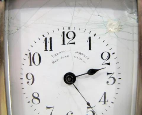 2- 8 Day French Carriage Clocks: 1.) Signed LeRoy dial; 8 day time only; porcelain dial; Arabic numerals; beveled glass, has key. (Dial damaged.) 5 1/...