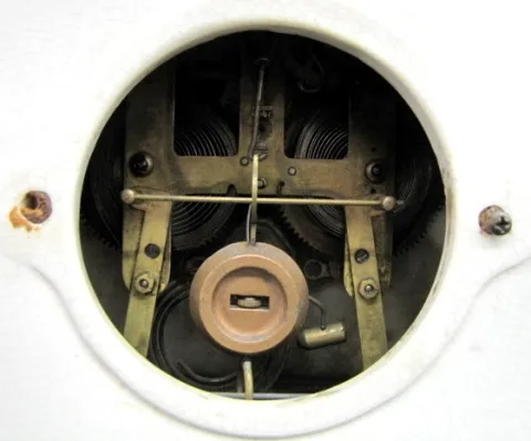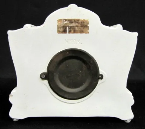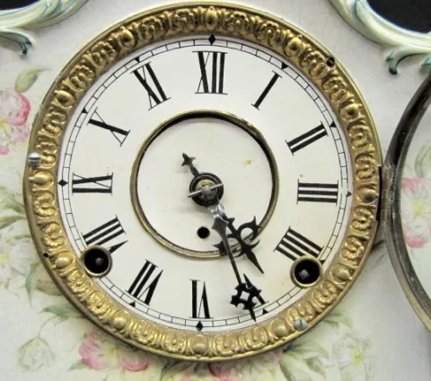 F. Kroeber No. 20. K. Floral China Clock: time and strike; partial paper label. 10" x 11 1/2"...