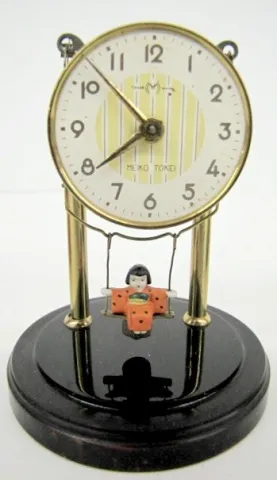 3 Oriental Swinger Dome Clocks: 1.) Red plastic base Meiko. 2.) Small black Meiko. 3.) Larger black Meiko. (Damaged dome.) Smallest 5"...