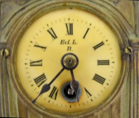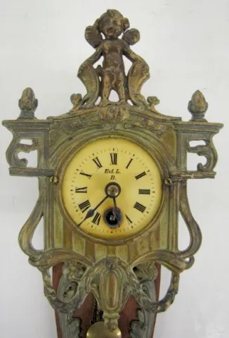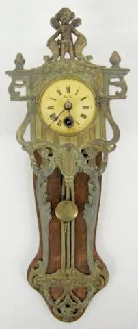 German Metal Hanging Cherub Clock: dial marked Ed. L. B.; stamped on back imph Depose, Germany; iron front and trim with cherub; has pendulum; not tes...