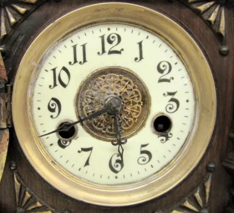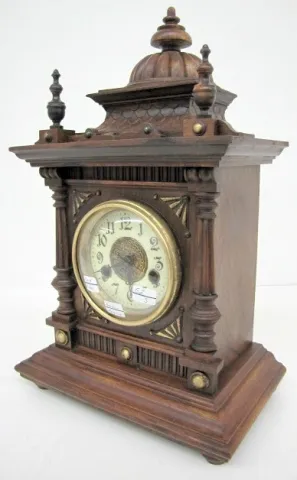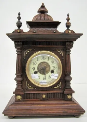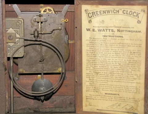 W.E. Watts, Nottingham "Greenwich" Clock: porcelain dial; time and strike; great interior label Made in Wurtemberg for W.E. Watts; has pendulum; not t...