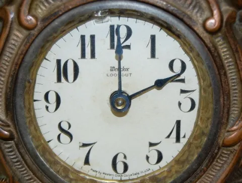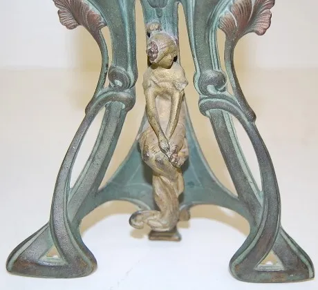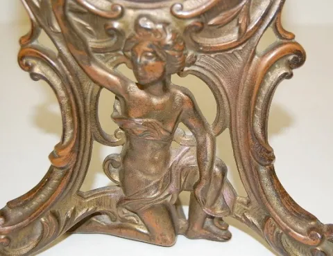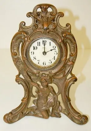 2 Metal Art Nouveau Novelty Dresser Clocks: 1.) Pat. Oct. 2, 1906 metal frame with kneeling semi nude figure; Westclox paper dial; bell alarm. (Not ru...