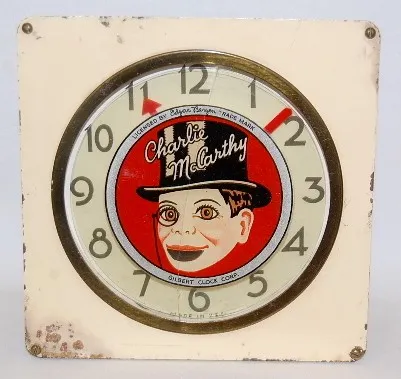 Gilbert Clock Charlie McCarthy Alarm Clock: dial reads Licensed by Edgar Bergen. (Not running; some dents and dings to case.)...