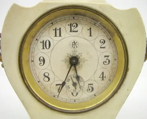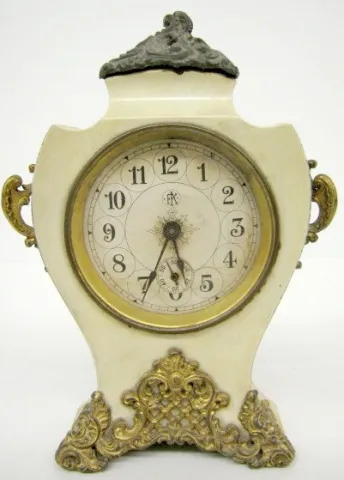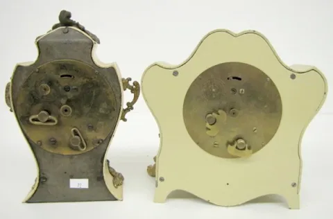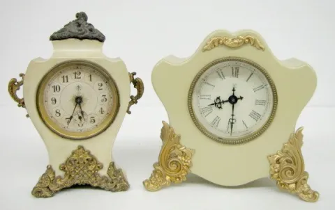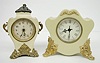2 F. Kreober Metal Alarm Clocks: 1.) 7 1/2" (Repainted; worn dial.) 2.) Ornate decorated metal, 8 1/2"....