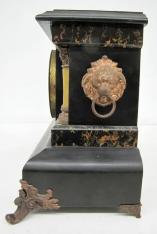 Seth Thomas Adamantine Four Post Mantle Clock: time and strike; lion head sides; has key and pendulum; partial label....