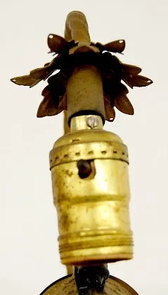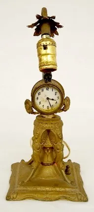 Metal Clock Lamp w/ Bear and Winged Figures: USA Clock; 1 3/4" dial; electrified for lamp; wind up clock works; base is marked M.L. Co. 1926. (Wants t...