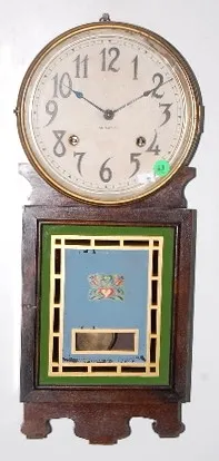Ingraham Art Deco Time and Strike Wall Clock: painted glass. (Glass has some losses.) 20"...
