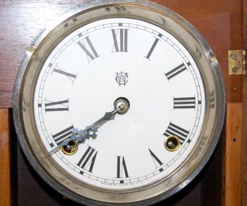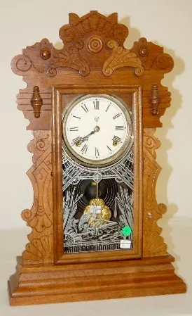 Waterbury "Gibson" Walnut Carved Kitchen Clock: time and strike....