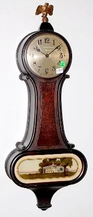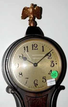 Small Size New Haven Banjo Clock: metal dial; time only; eagle finial; key and pendulum. 26"...