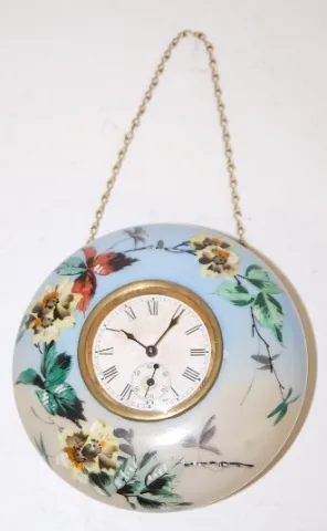 Welch Mt. Washington Hanging Wall Clock: marked on back; paper dial; floral painted case. (Not running.) 6 1/4"...